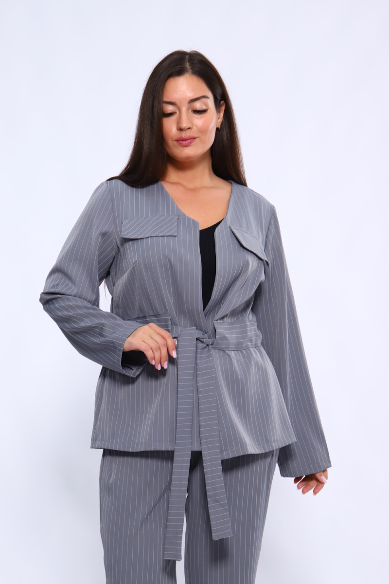 Элегантный дизайн: Жакет из этого комплекта отличается продуманным кроем, который подчеркивает достоинства фигуры и создает изысканный силуэт. Карманы и пояс добавляют функциональность и акцентируют стиль.